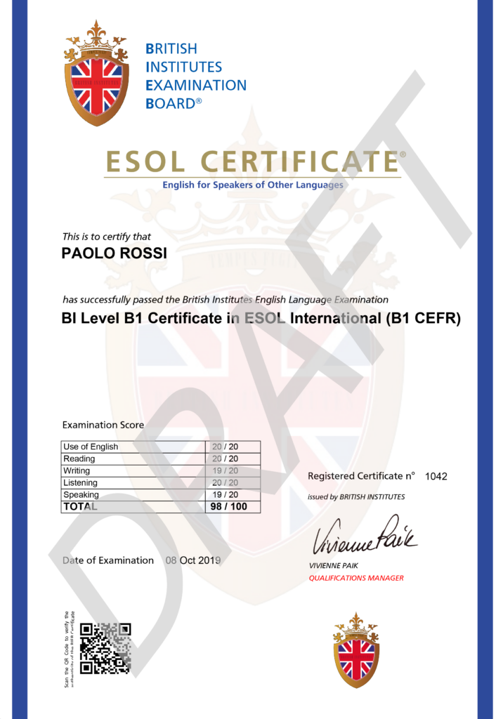 La certificazione ottenuta rilascia punteggio ai fini di concorsi, graduatorie, ecc in base al bando di riferimento. È inoltre riconosciuta presso le Università. Rilasciata dalla British Institutes ESOL ed è riconosciuta dal MIM.